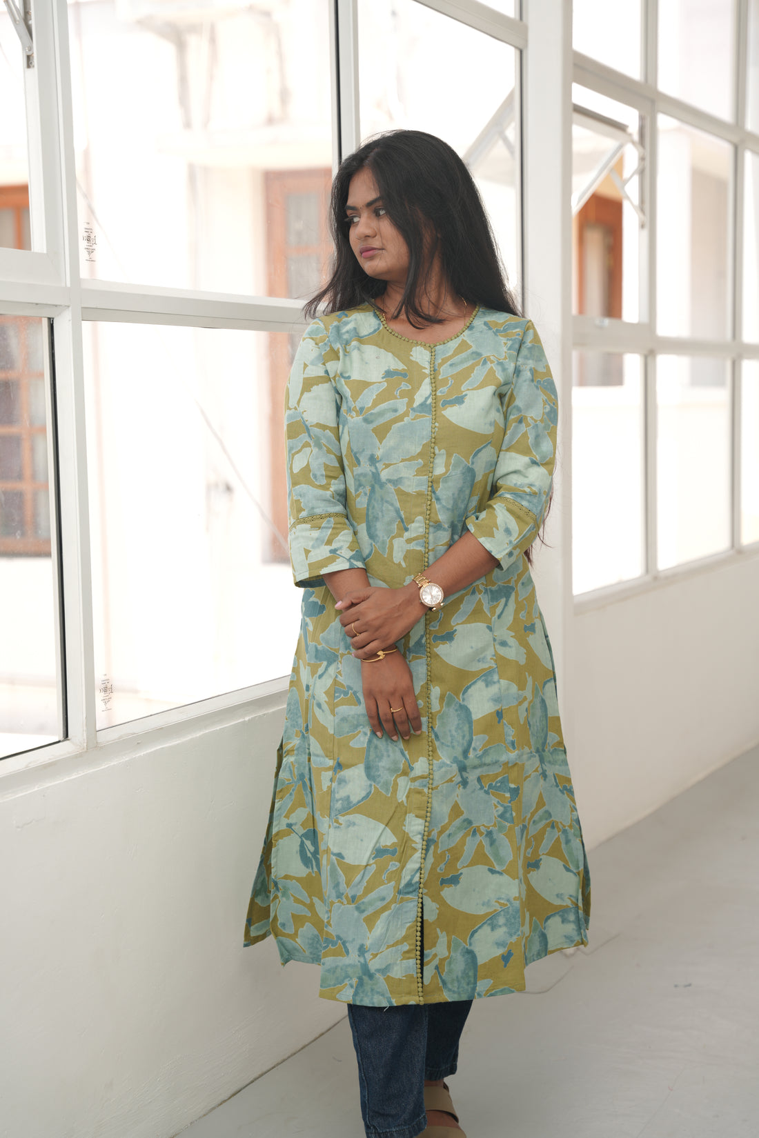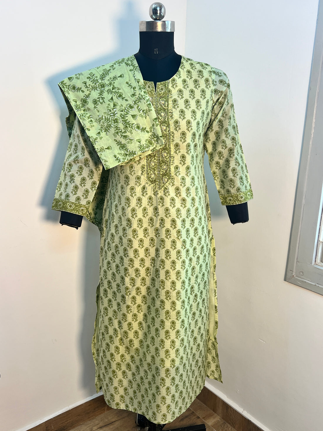 This green floral cotton kurta set is crafted from premium cotton, ensuring a breathable and...