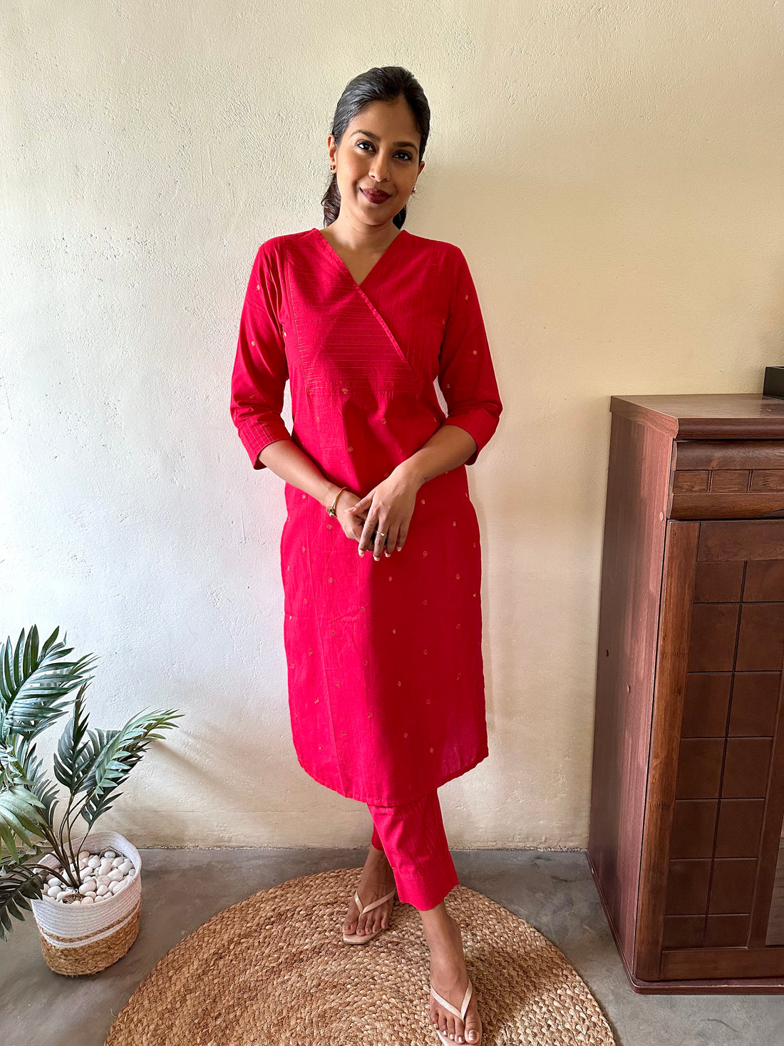 Fabric: Lightweight Handloom cotton, perfect for all-day comfort.Color: Red with delicate gold embroidery.Kurta: A straight-cut,...