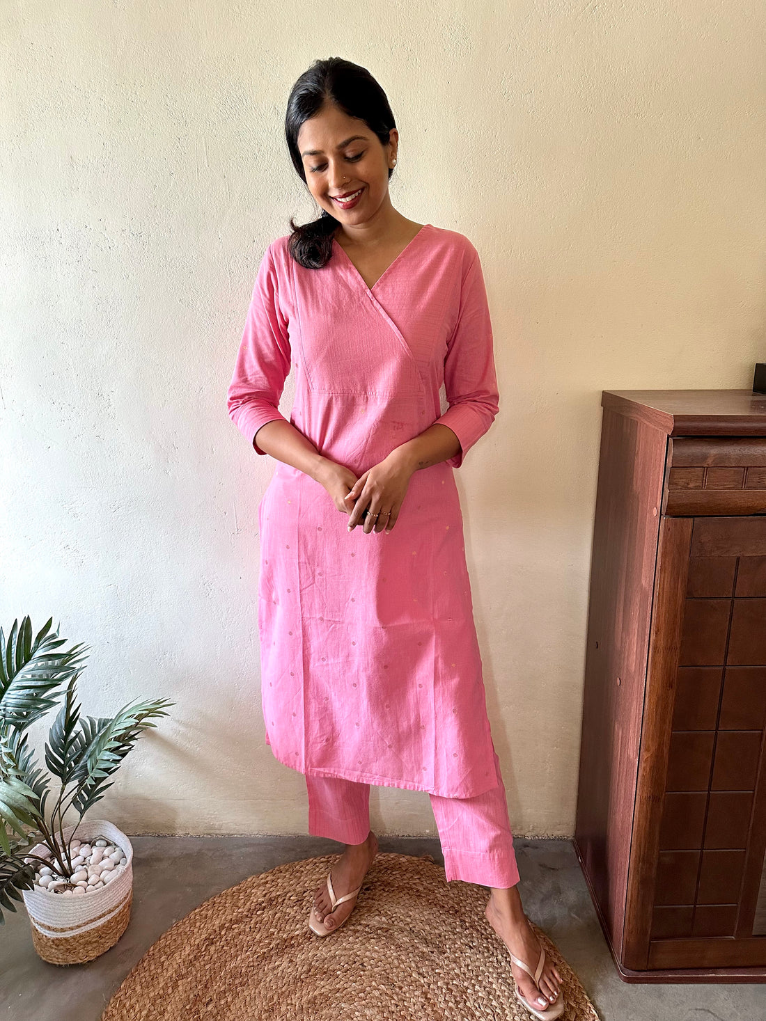 Fabric: Crafted from soft and breathable handloom cotton, ensuring all-day comfort.Color: Mauve-pinkKurta: Front button placket...