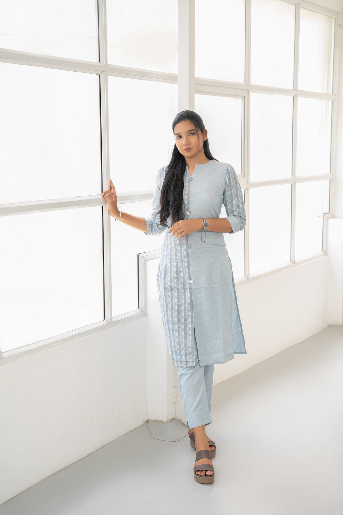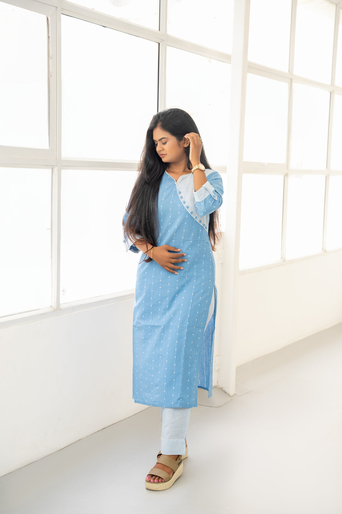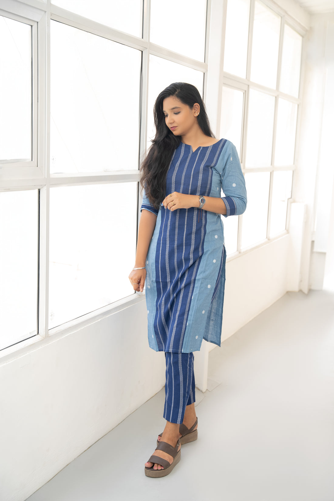 Fabric: Likely made from cotton blends. Color: The kurta set features shades of blue with...