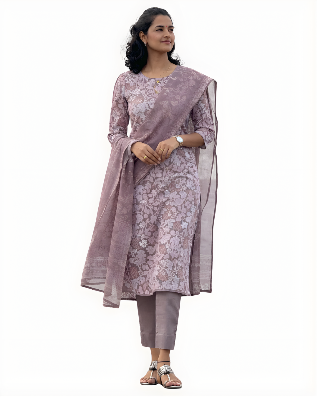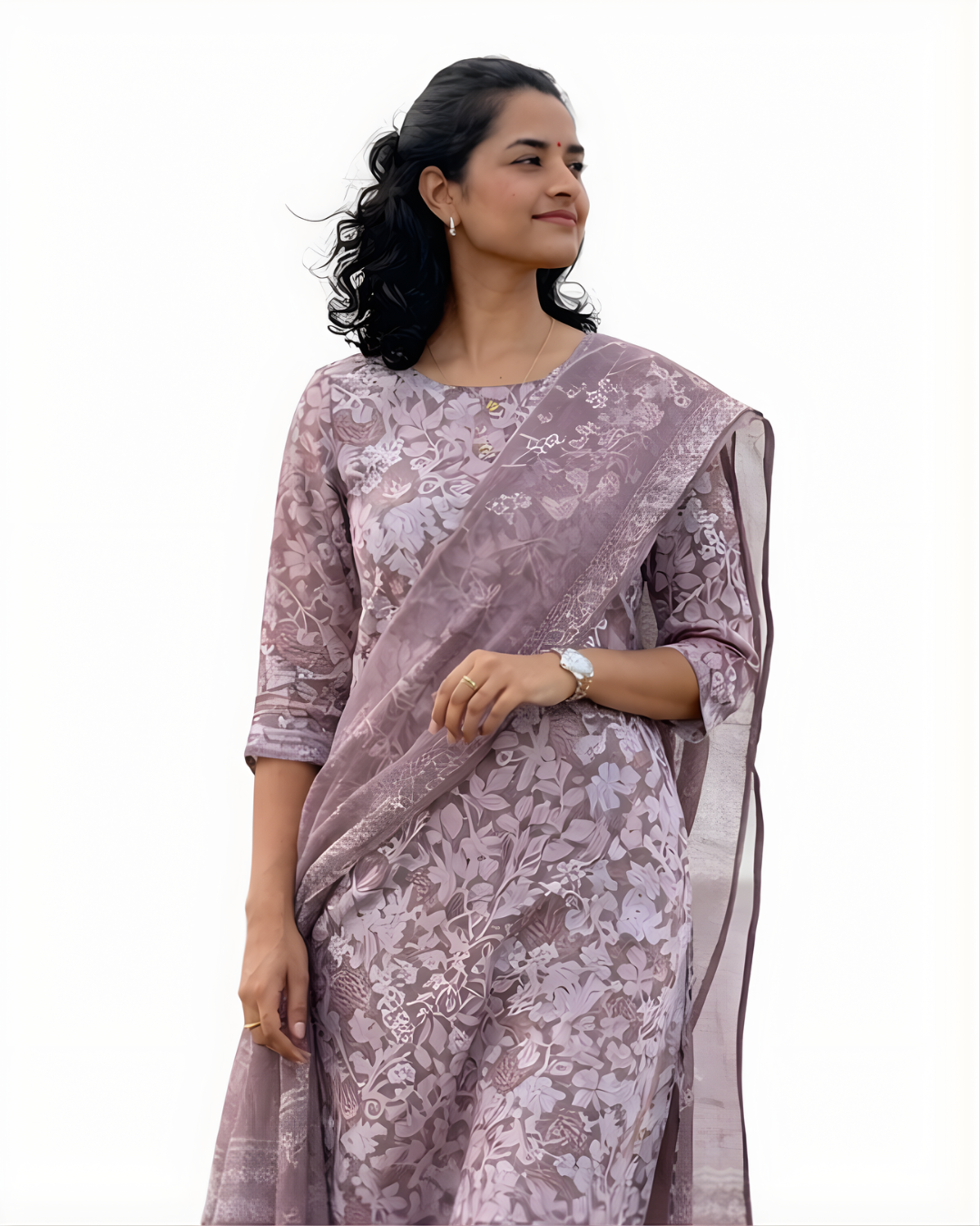 Color:Soft dusty mauve with intricate white floral prints, offerings a graceful look.