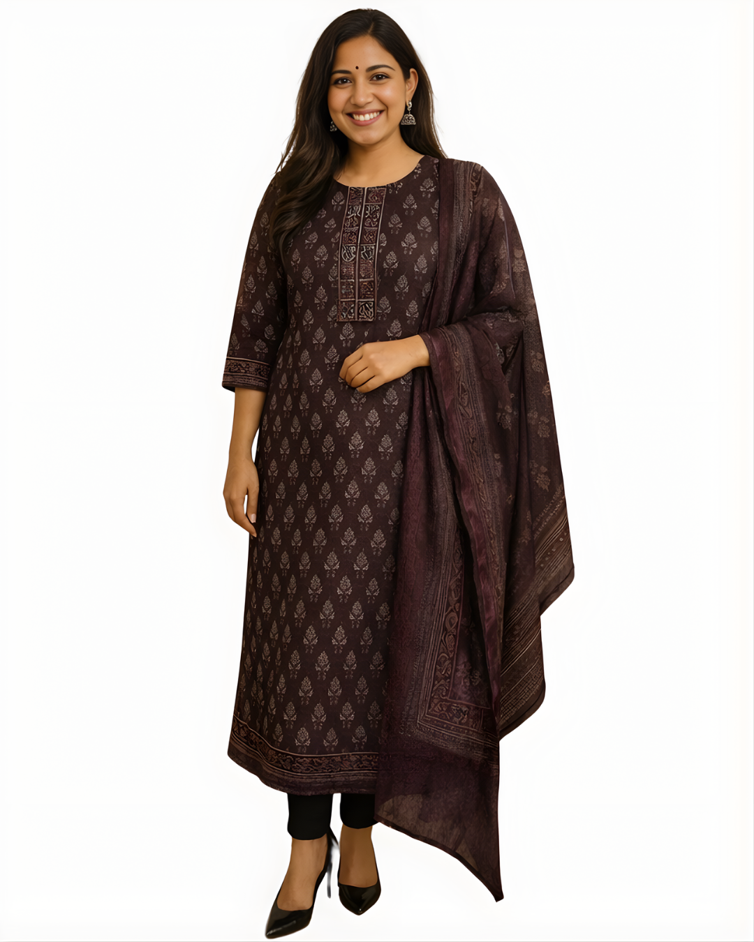 KURTA STYLE: Straight-cut, long-length kurta with a round neckline and minimal embroidery on the yoke area.