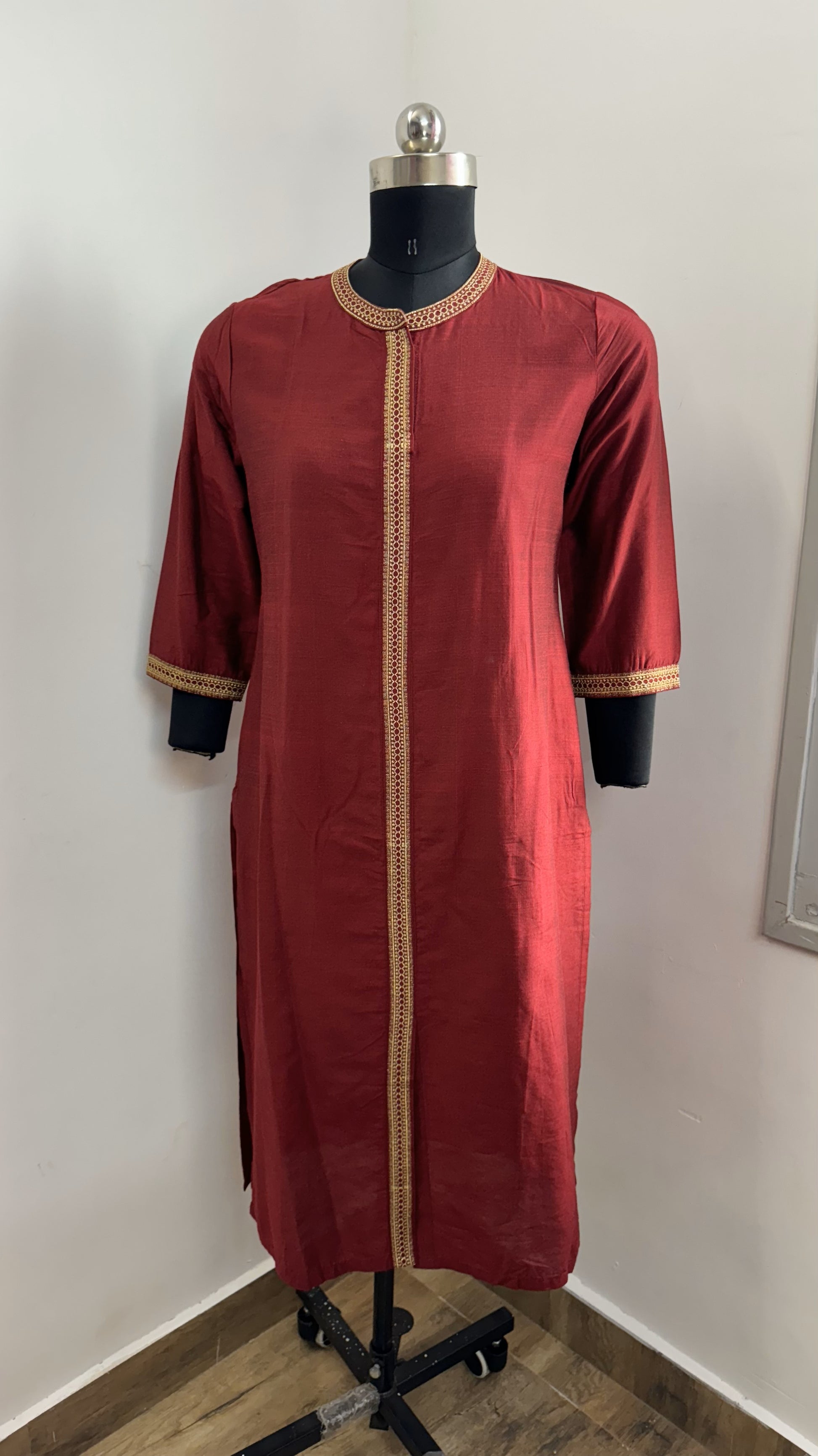 EMBROIDERY: Golden threadwork along the neckline, front opening, and sleeve cuffs.