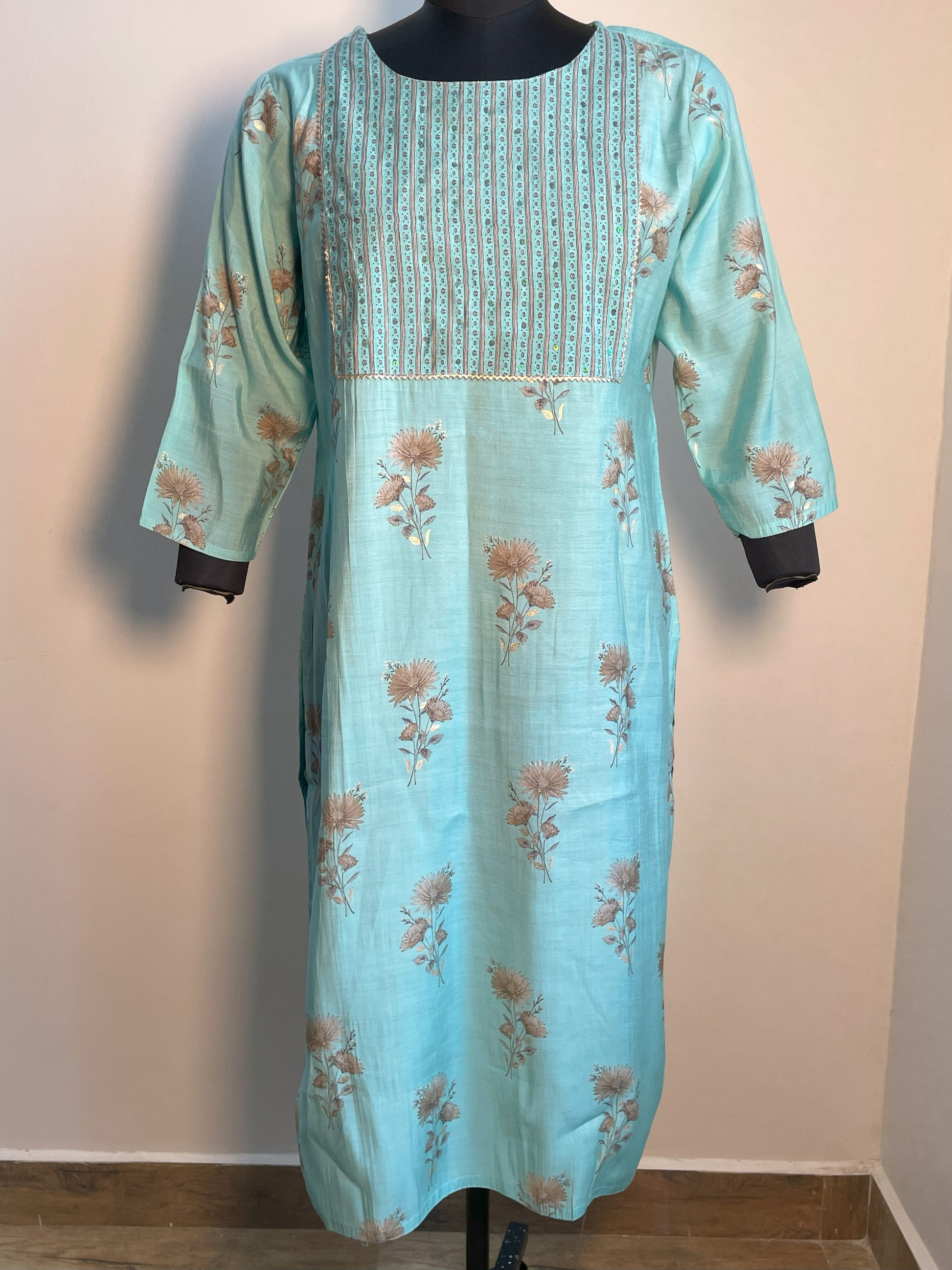 Blue floral muslin kurta is a true embodiment of versatility, effortlessly transitioning from special occasions to everyday wear. Crafted from premium muslin fabric, it offers a soft, breathable texture that drapes elegantly, ensuring both comfort and style.