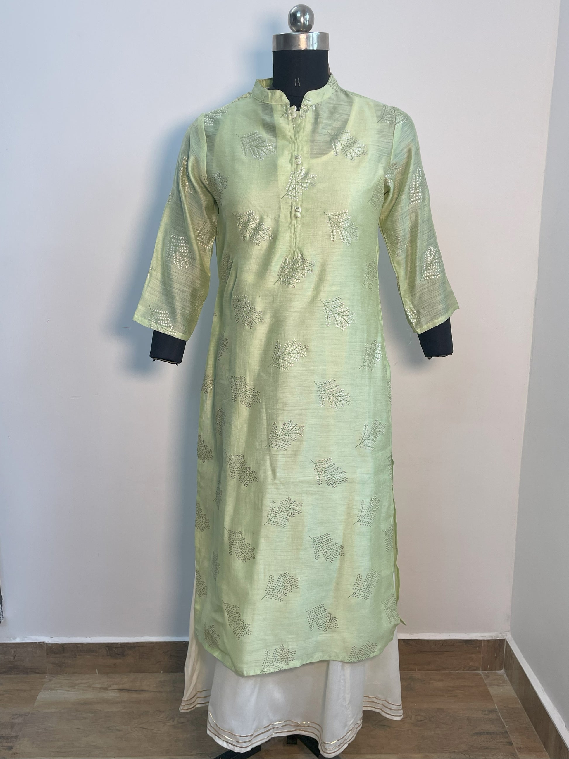 Sage green chanderi kurta with an inner frock epitomizes versality, effortlessly transitioning from special occasions to everyday wear. Crafted from premium chanderi cotton, it delivers exceptional softness and a breathable, lightweight feel, draping with graceful elegance.